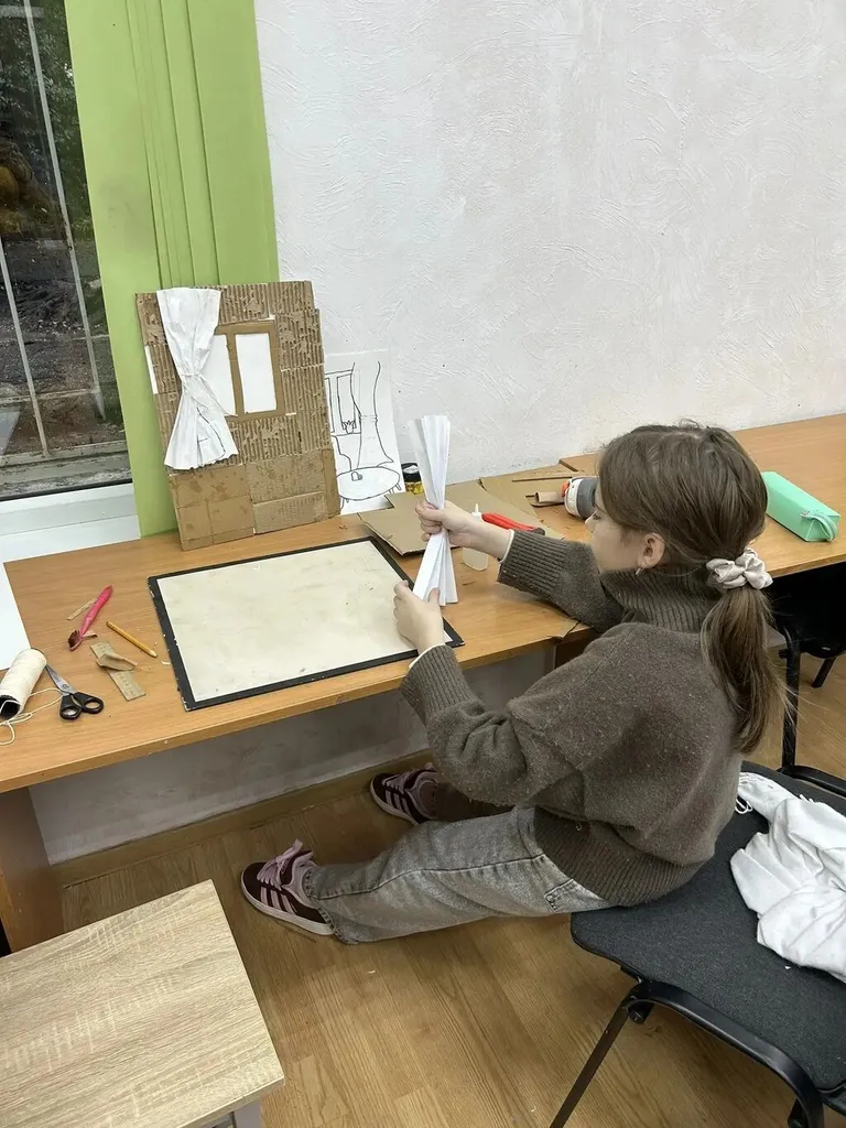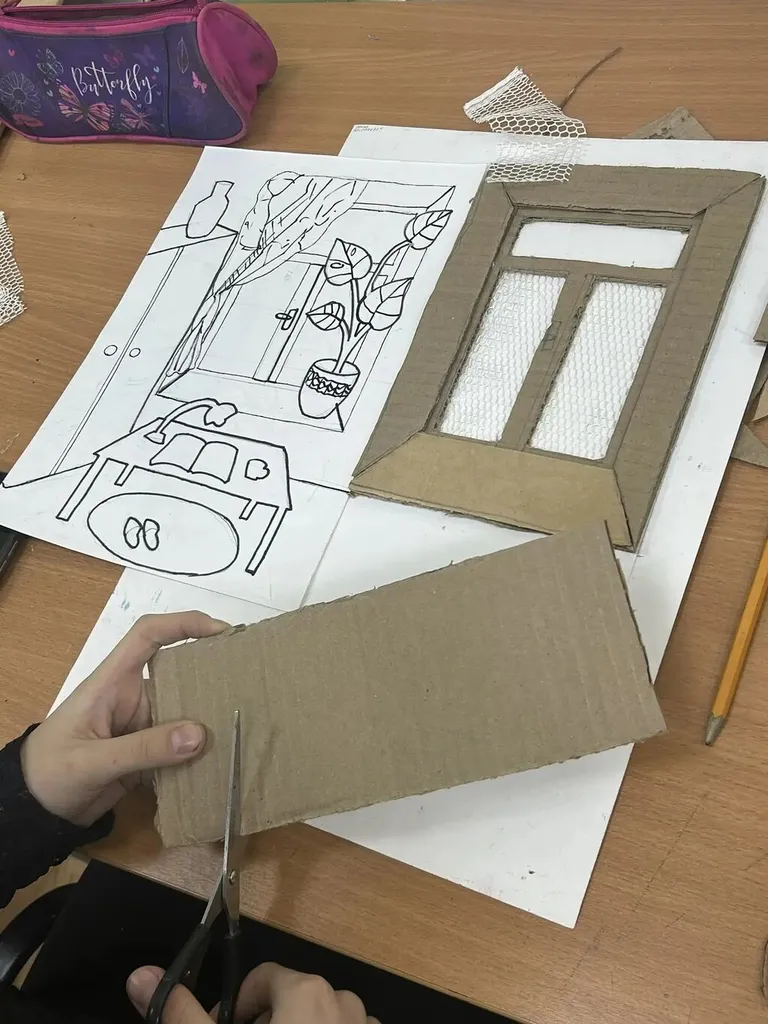 ✂️📦 В Детской художественной школе №3 преподаватель Морозкина Елизавета Сергеевна провела урок в 3 «В» ДПТ классе на тему: «Объемное изображение, интерьер с окном». 🪟🛋️