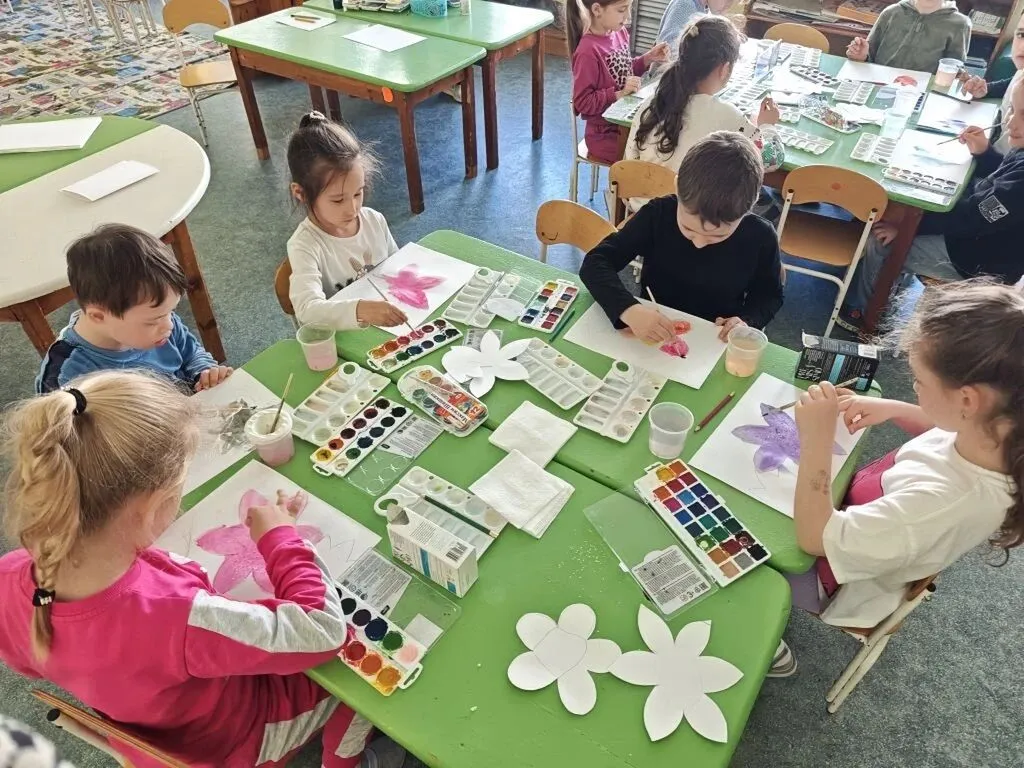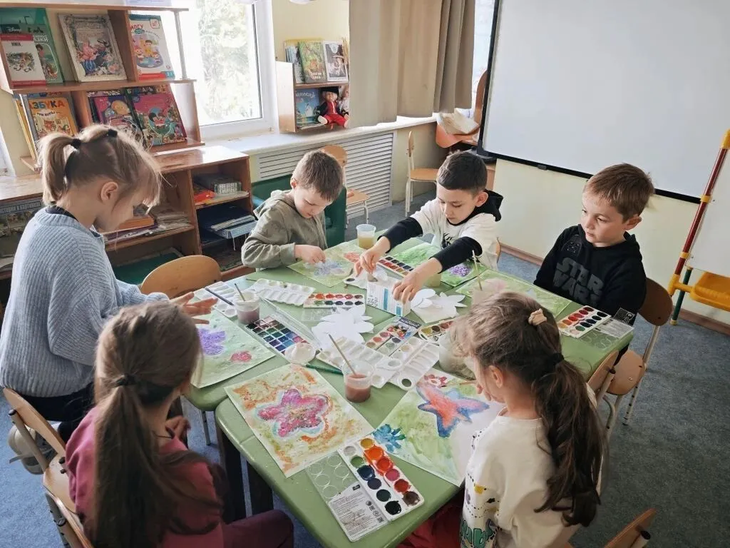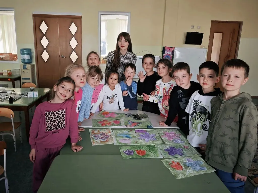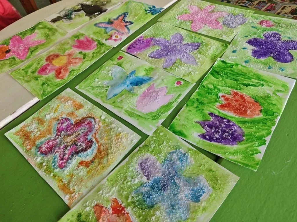 Темой занятия стала «Весенняя полянка». Юные художники учились изображать первые цветы 🌼🌺, но это было не простое рисование! Главным сюрпризом стало использование акварели и обычной соли 🧂💧. На глазах у ребят краска покрывалась причудливыми узорами, превращая рисунки в пушистые и фактурные шедевры.