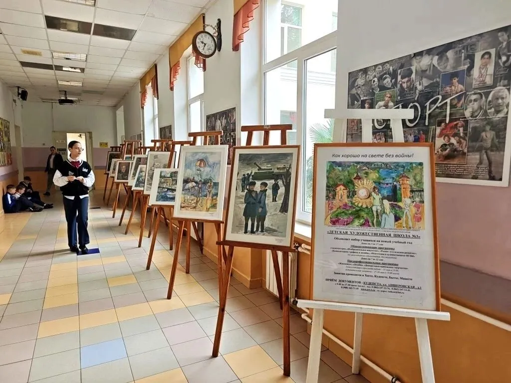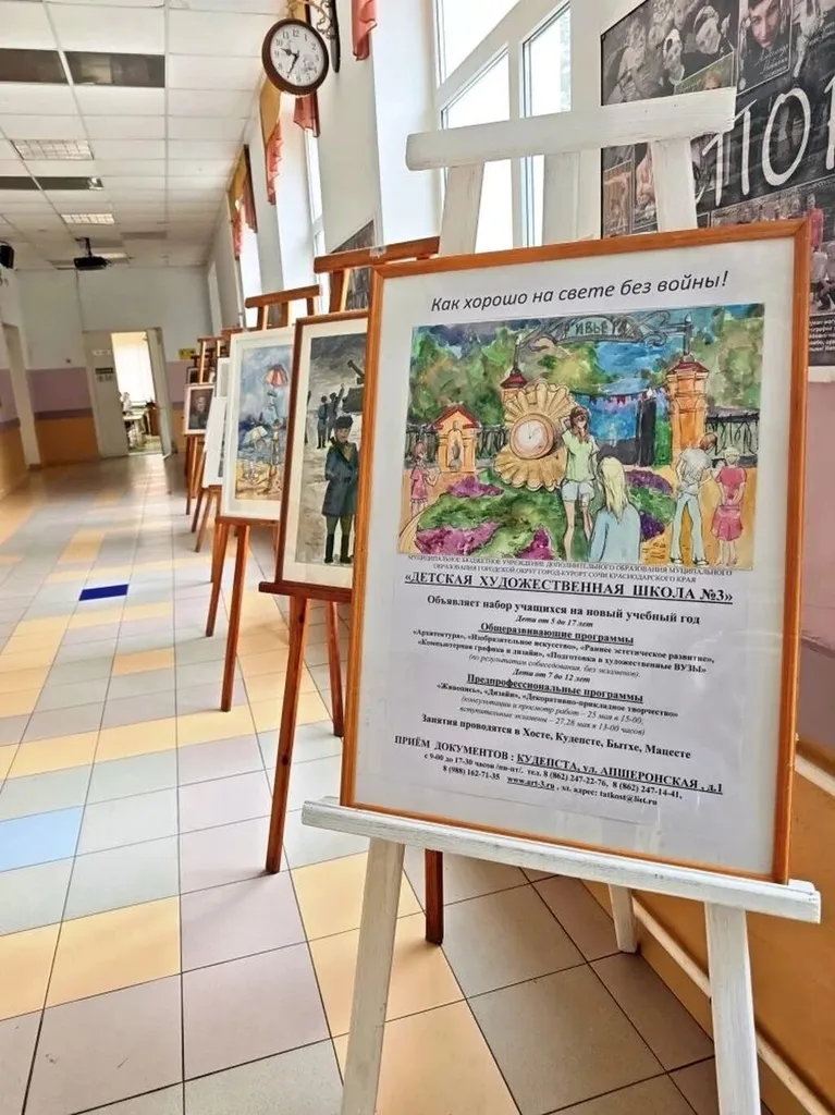 🎨 В Муниципальном общеобразовательном бюджетном учреждении гимназия №5 города Сочи имени Героя Советского Союза Туренко Евгения Георгиевича открылась выставка «Как хорошо на свете без войны!». Её подготовили учащиеся Детской художественной школы №3. 🎉